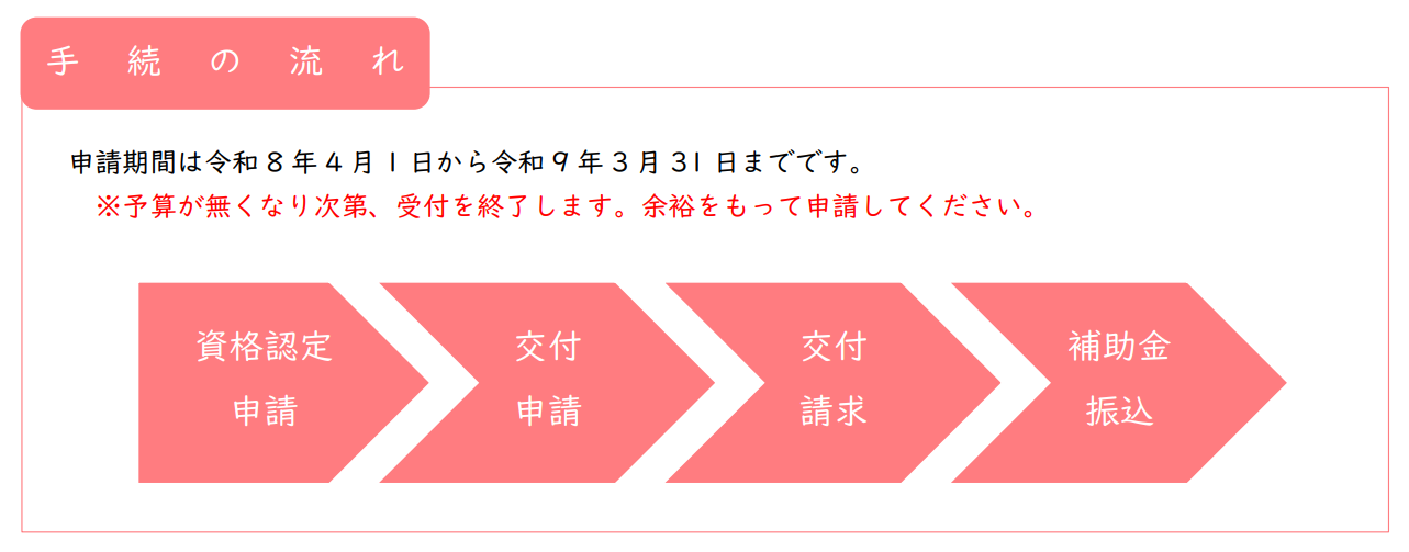 | 交付申請 | 令和8年4月1日 | 令和9年3月31日 または 予算額に達した時点 |