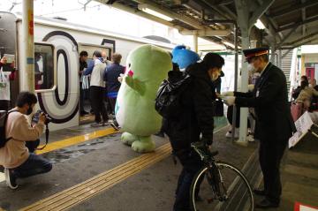 とっちー、くくりんもお出迎えし、乗車している皆さんには記念品をお渡ししました♪