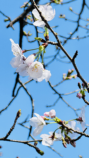 八鶴湖の場合は、八鶴館(八鶴亭)前の桜が標準木で、5~6輪以上咲くと「開花」です。