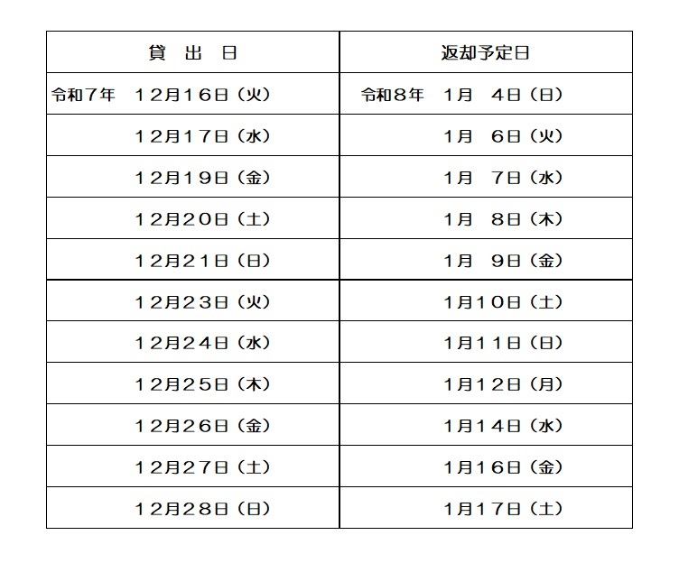 令和7年12月16日(火)から令和7年12月28日(日)まで、以下の通りとします。