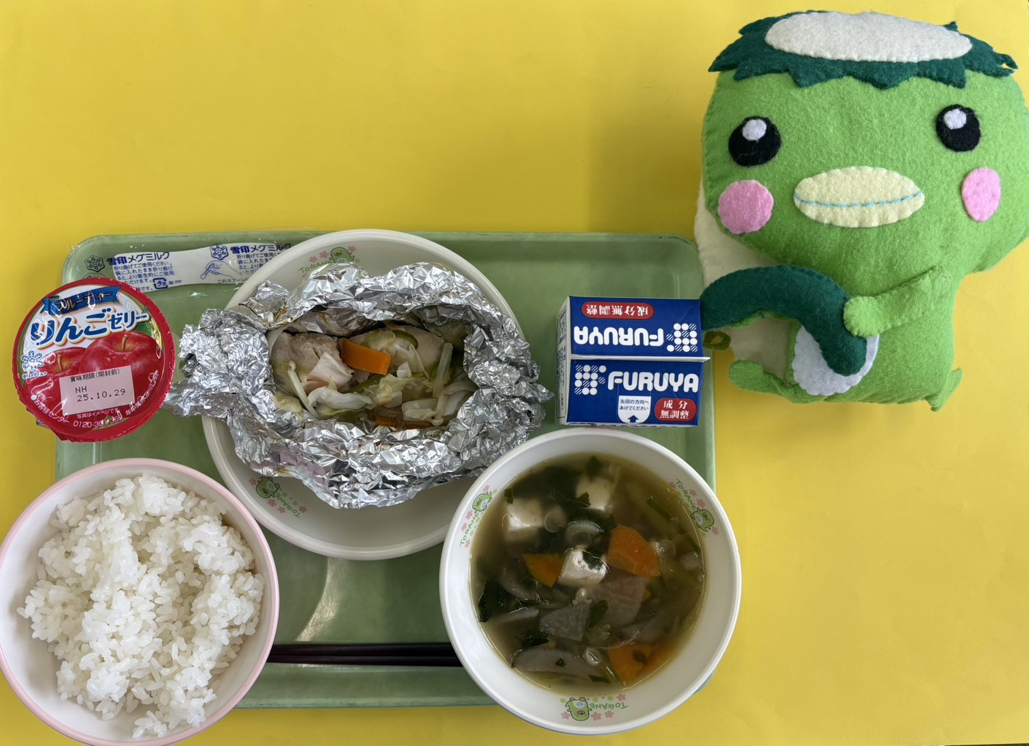 ごはん・鶏肉みそホイル焼き・根菜汁・りんごゼリー