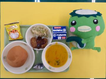丸パン・かぼちゃハンバーグ・ボイルキャベツ・パンプキンシチュー・デザート