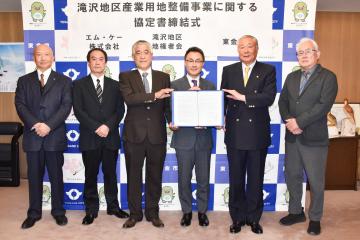 企業の新たな施設の立地及び市内企業の追加投資の促進を図るとともに、本市における産業の集積及び雇用機会の拡大を促進し、本市経済を活性化するために実施する滝沢地区産業用地整備事業において、エム・ケー株式会社が事業計画の認定を受けた事業者として決定されたことを確認し、地権者会、エム・ケー株式会社及び東金市が相互に協力し、事業を確実かつ円滑に推進するために協定書を締結いたしました。