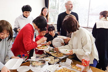 東金IVC日本語教室では、普段日本語を学ぶ生徒と、ボランティアで教える先生たちとの交流会が行われ、お互いに持ち寄った世界の料理を楽しみました。ビンゴなどで盛り上がり、日本語を学ぶ仲間で交流を深めました。