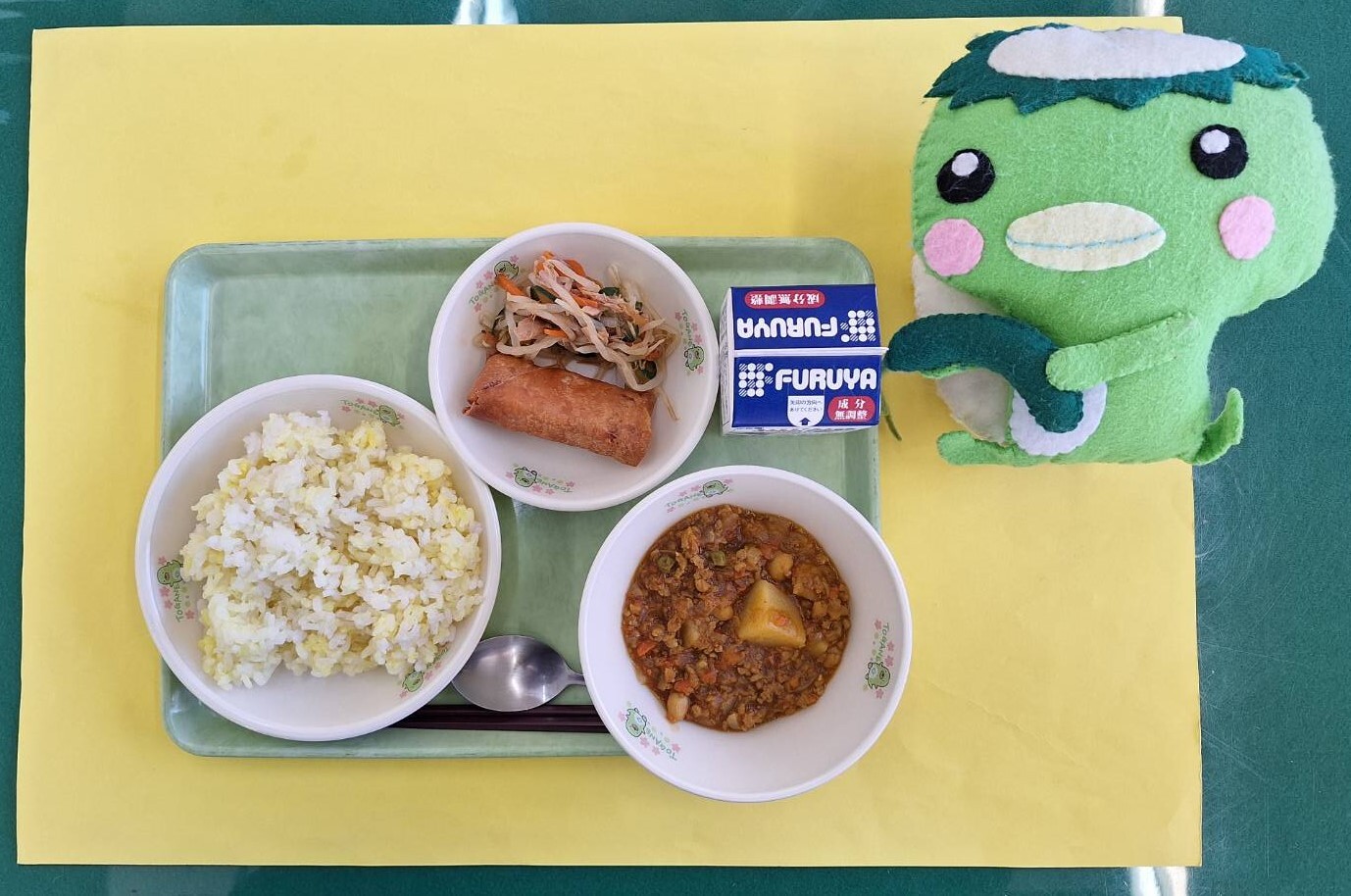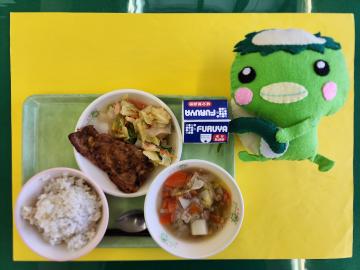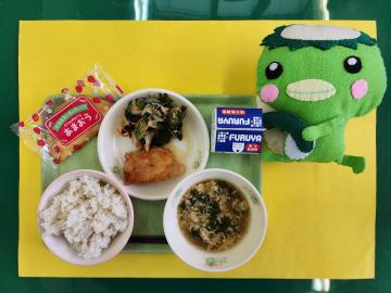 ごはん・いかねぎ味噌焼き・大豆あまからあげ・ゆばわふうスープ・グミ