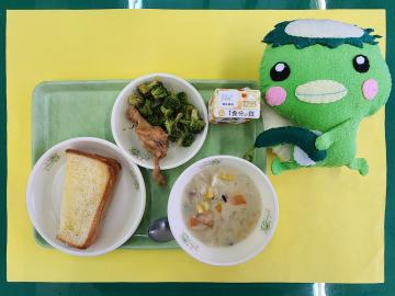 シュガートースト・とり肉マーマレード煮・ブロッコリーおかか和え・クリームシチュー・野菜ジュース