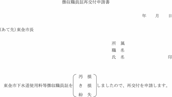 第5条 徴収職員は、徴収職員証を汚損し、き損し、又は紛失したときは、徴収職員証再交付申請書(別記第2号様式)により、市長に再交付を申し出なければならない。