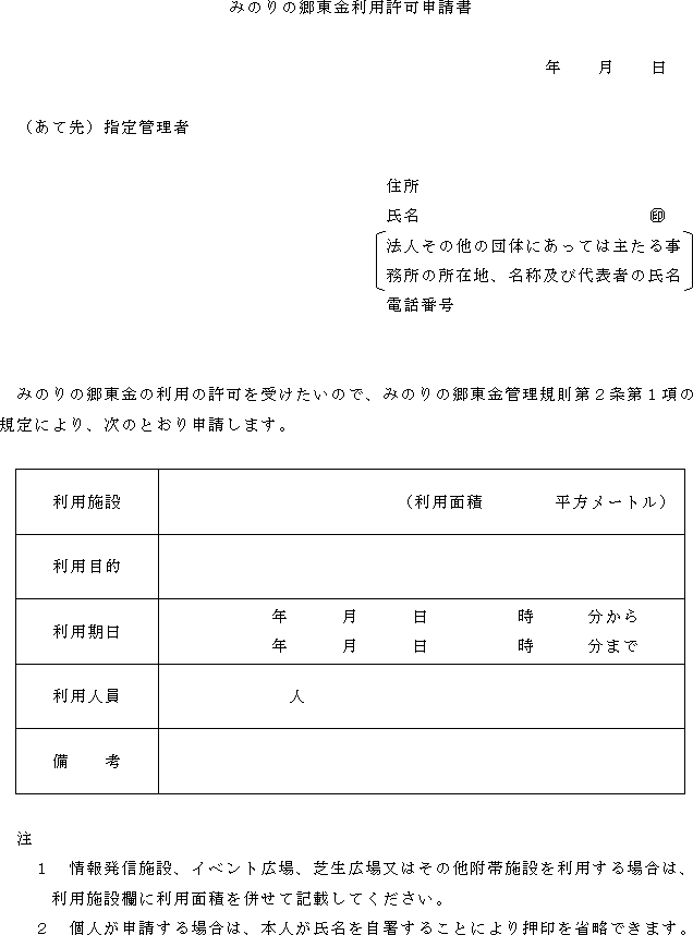 第2条 条例第8条第1項前段の許可を受けようとする者(以下「申請者」という。)は、みのりの郷東金利用許可申請書(