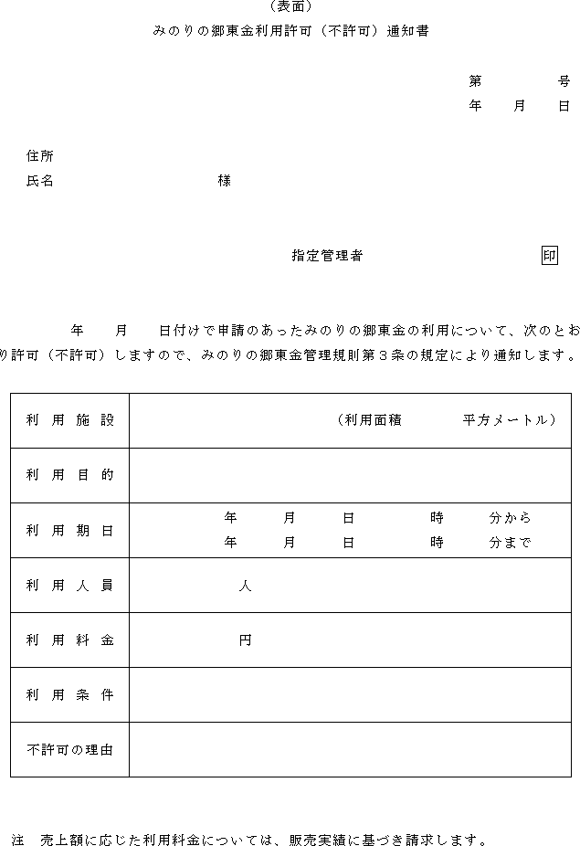 第3条 指定管理者は、前条第1項の規定による申請があったときは、当該内容を審査し、利用の可否を決定し、みのりの郷東金利用許可(不許可)通知書(