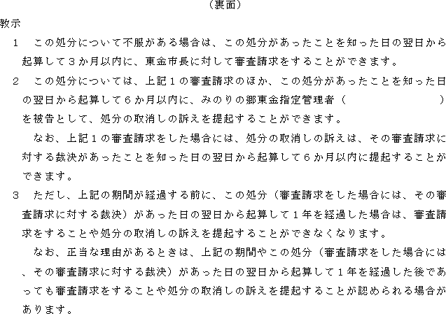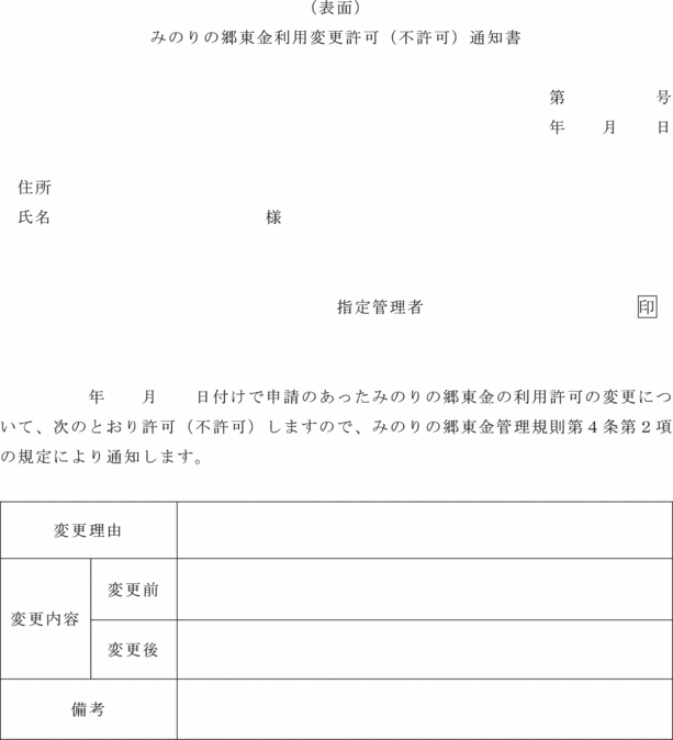 2 指定管理者は、前項の規定による申請があったときは、当該内容を審査し、変更の可否を決定し、みのりの郷東金利用変更許可(不許可)通知書(