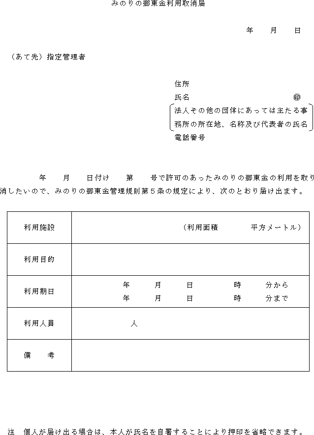 第5条 利用者は、みのりの郷の施設の利用を取り消そうとするときは、みのりの郷東金利用取消届(