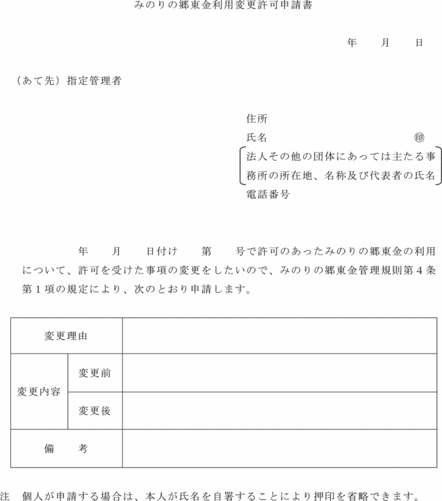 条例第8条第1項後段の規定による変更の許可を受けようとするときは、みのりの郷東金利用変更許可申請書(