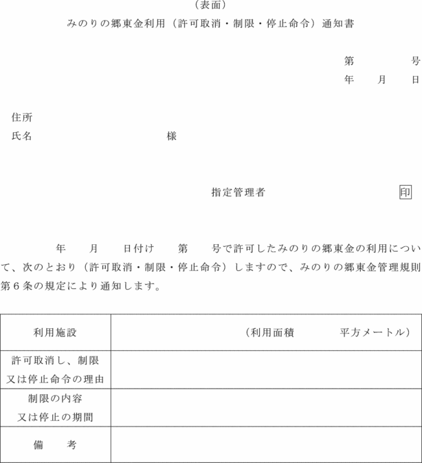 条例第9条第1項の規定により許可を取り消し、又は利用を制限し、若しくは利用の停止を命ずるときは、みのりの郷東金利用(許可取消・制限・停止命令)通知書(